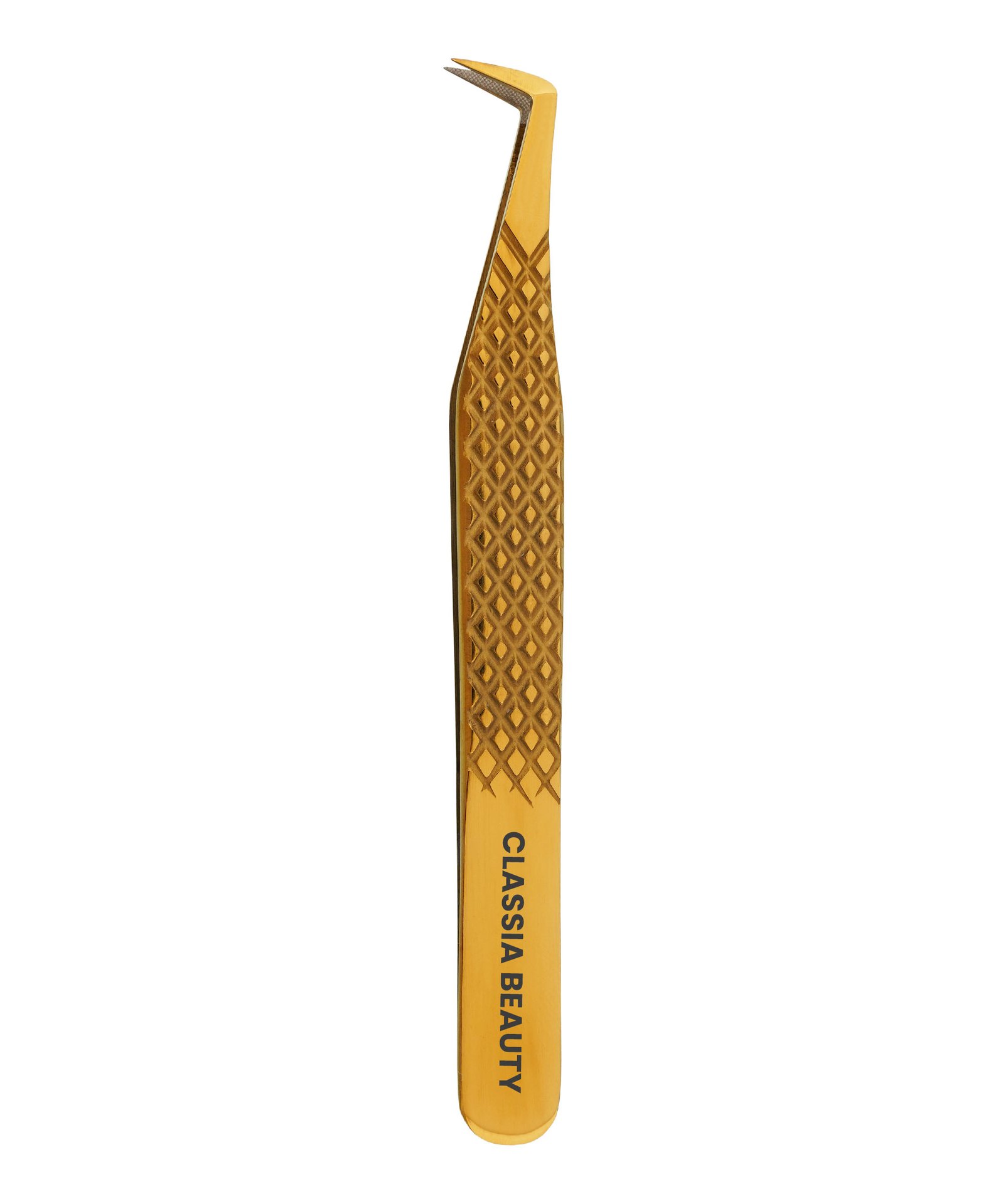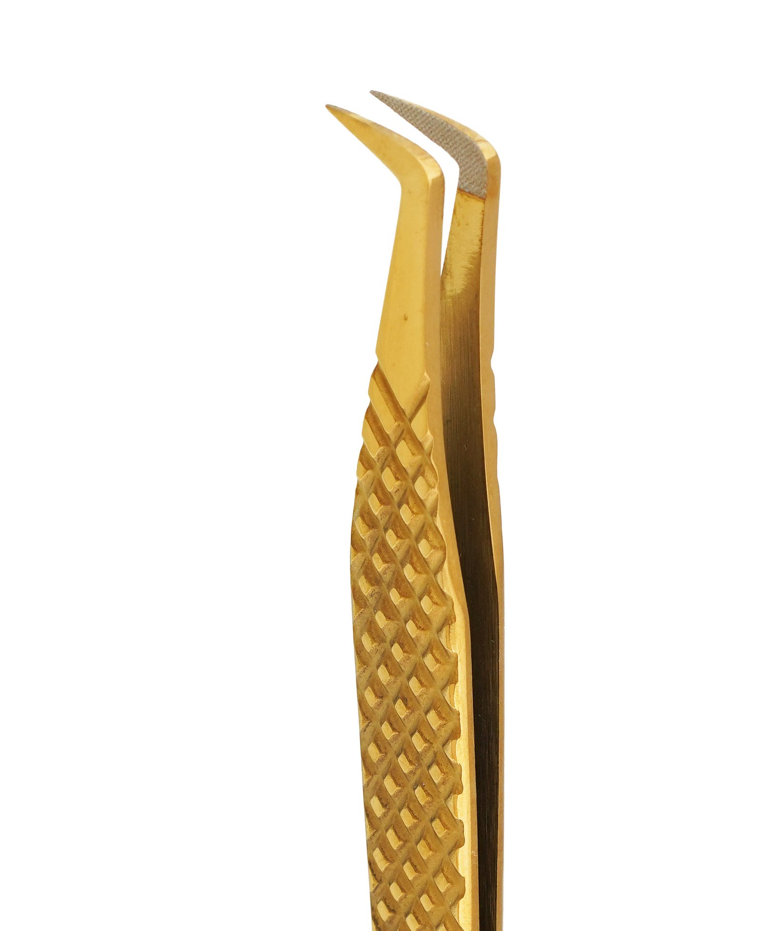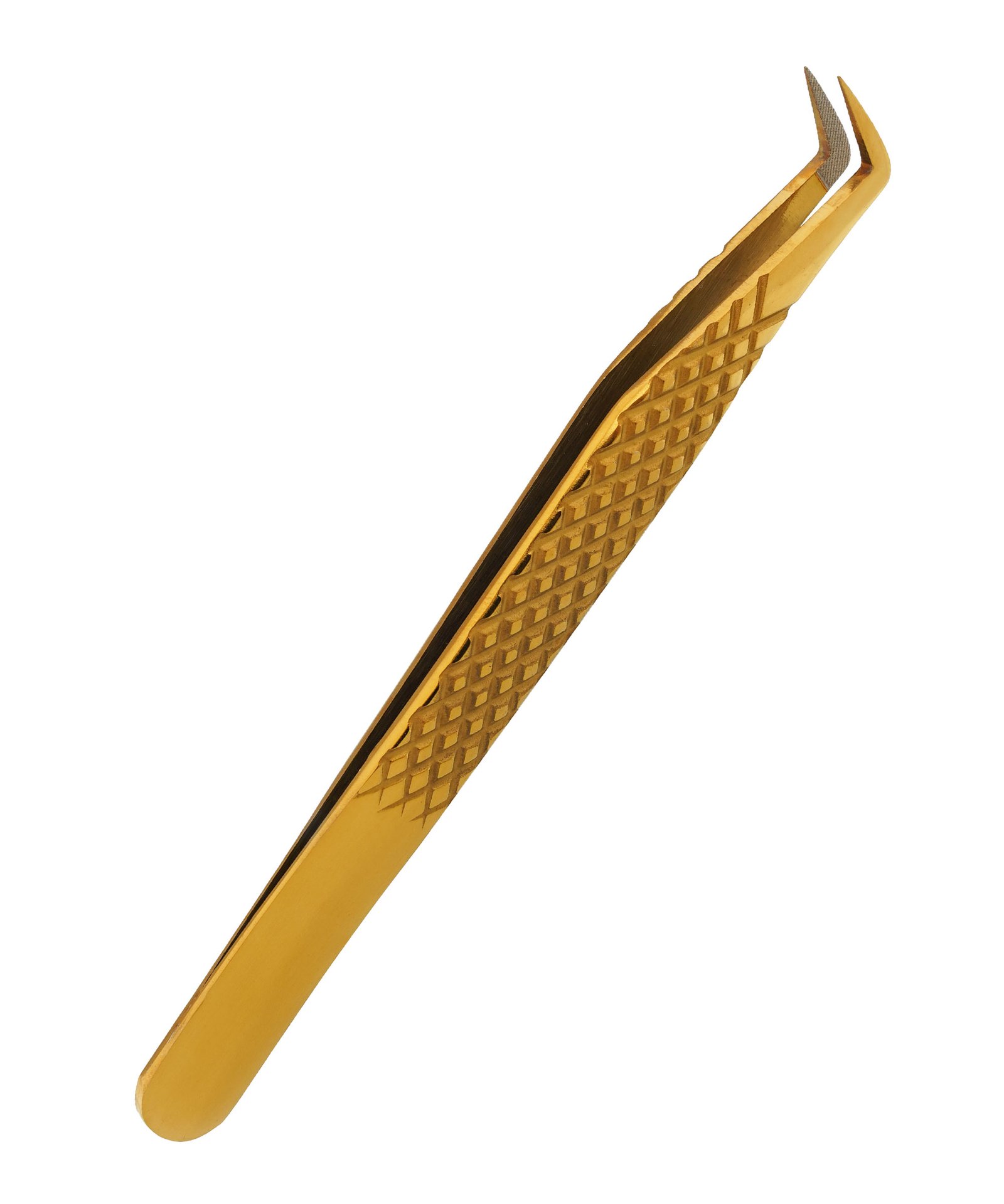 Gold 90-degree boot eyelash extension tweezer These premium stainless-steel lash tweezers offer precision, durability, and effortless control. Perfect for selecting, isolating, and applying eyelash extensions, their fine curved tips ensure easy maneuvering at any angle. Lightweight, rust-free, and compact, they’re ideal for both professional use and everyday beauty routines. The low-resistance, quick-rebound design provides smooth, comfortable handling every time.