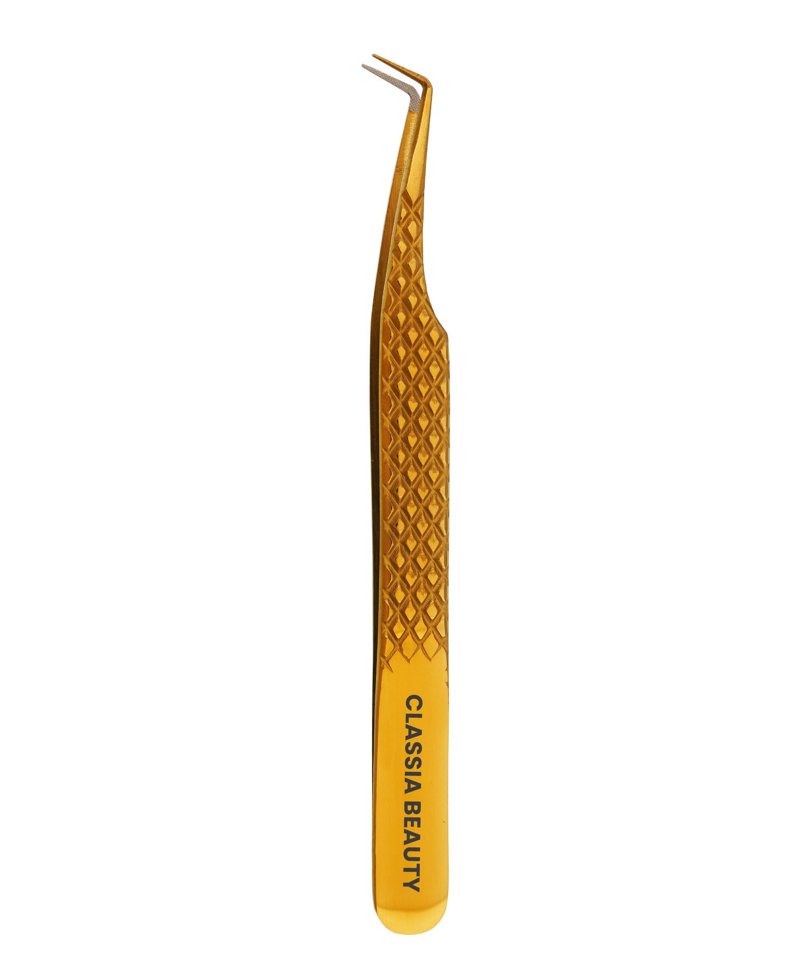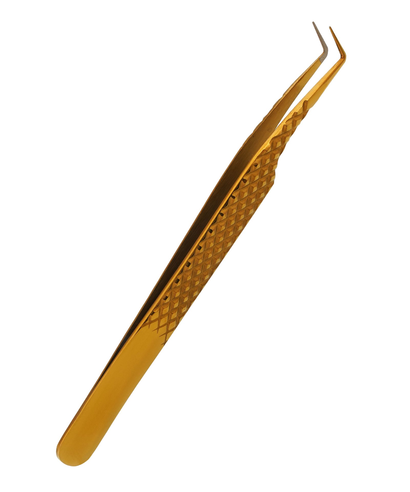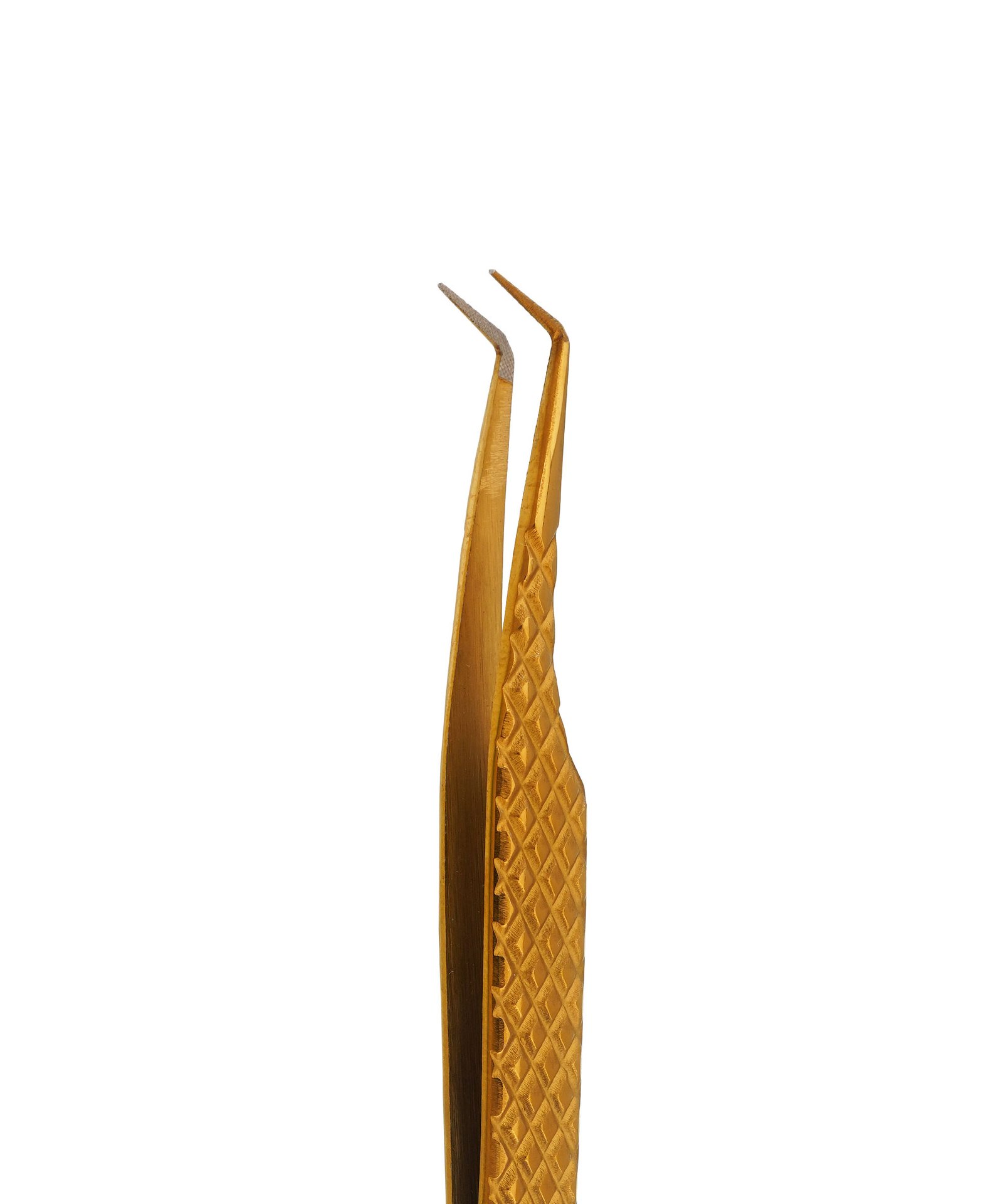 Gold 90-degree eyelash extension tweezer  These premium stainless-steel lash tweezers offer precision, durability, and effortless control. Perfect for selecting, isolating, and applying eyelash extensions, their fine curved tips ensure easy maneuvering at any angle. Lightweight, rust-free, and compact, they’re ideal for both professional use and everyday beauty routines. The low-resistance, quick-rebound design provides smooth, comfortable handling every time.