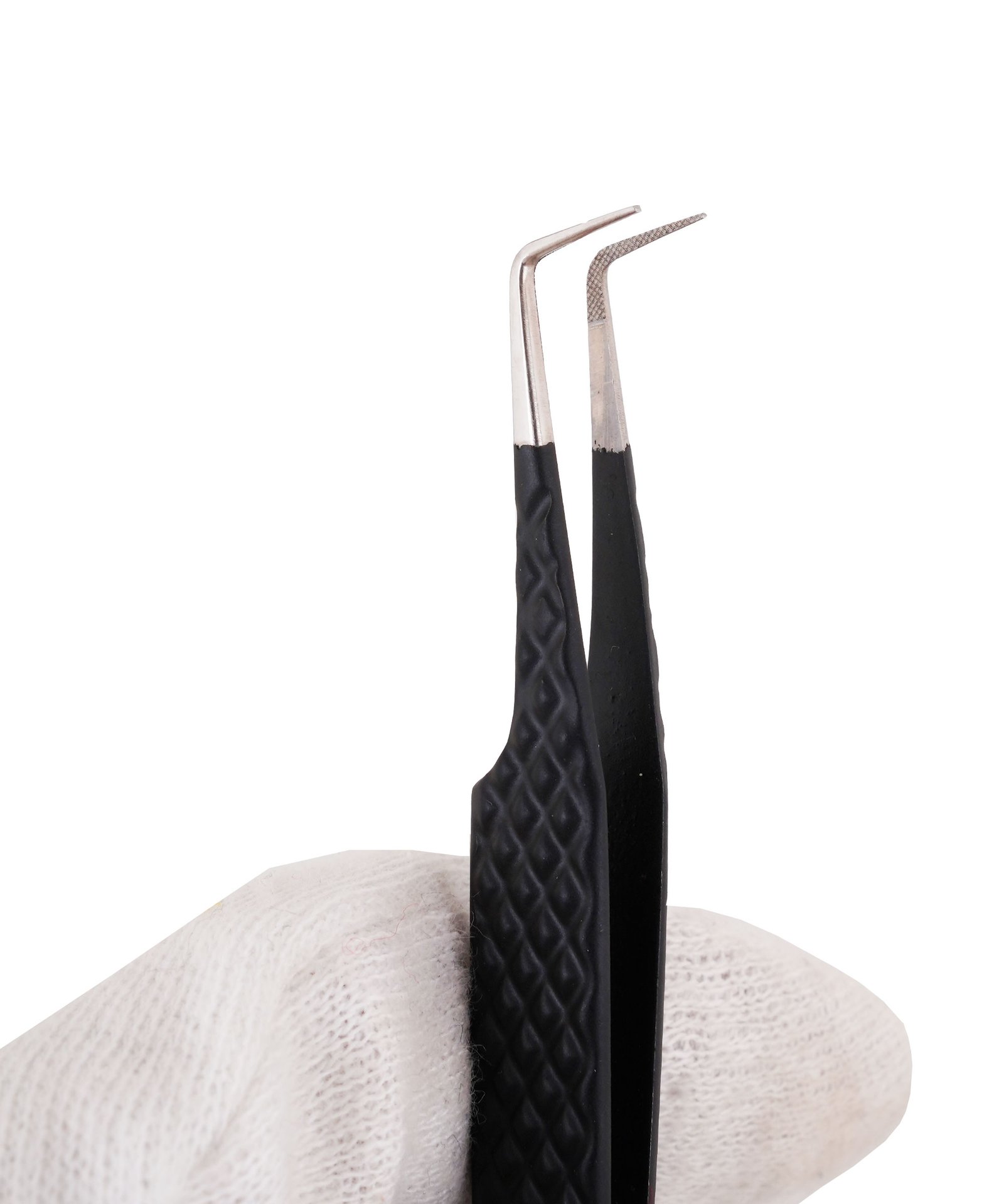 Black 90-degree eyelash extension tweezer with silver Tip Fiber-Tip has been crafted using 100% stainless steel for precision and, consequently, convenience. Moreover, this lightweight, durable set is perfect for lash artists who are working on their own projects as well as professional lash artists.