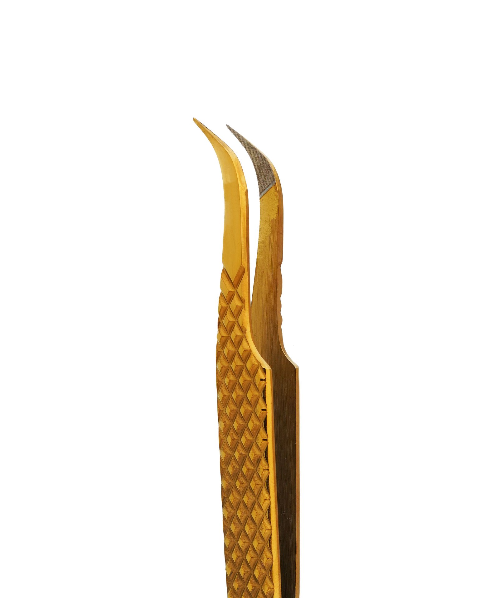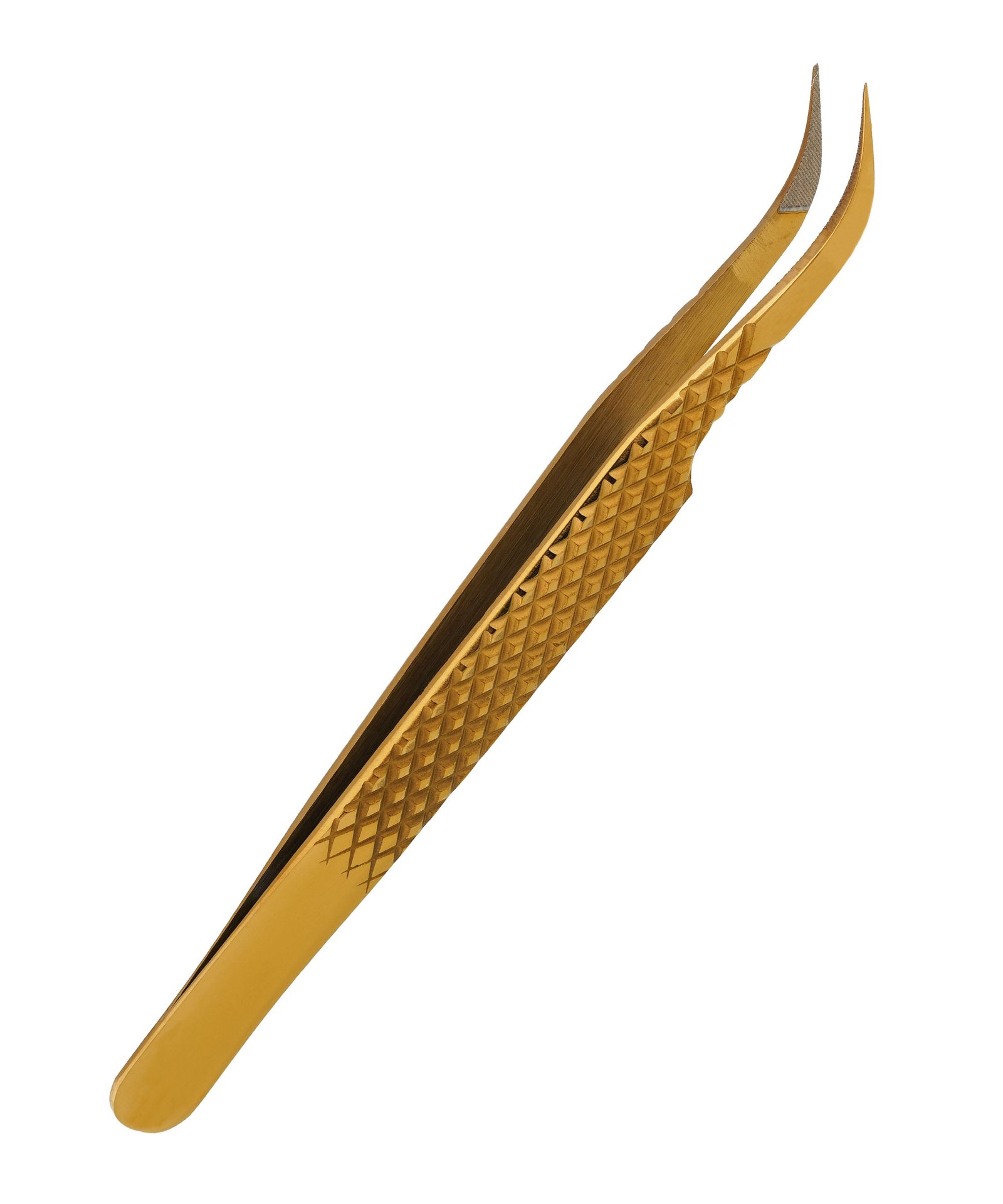 Gold curve eyelash extension tweezer These premium stainless-steel lash tweezers offer precision, durability, and effortless control. Perfect for selecting, isolating, and applying eyelash extensions, their fine curved tips ensure easy maneuvering at any angle. Lightweight, rust-free, and compact, they’re ideal for both professional use and everyday beauty routines. The low-resistance, quick-rebound design provides smooth, comfortable handling every time.