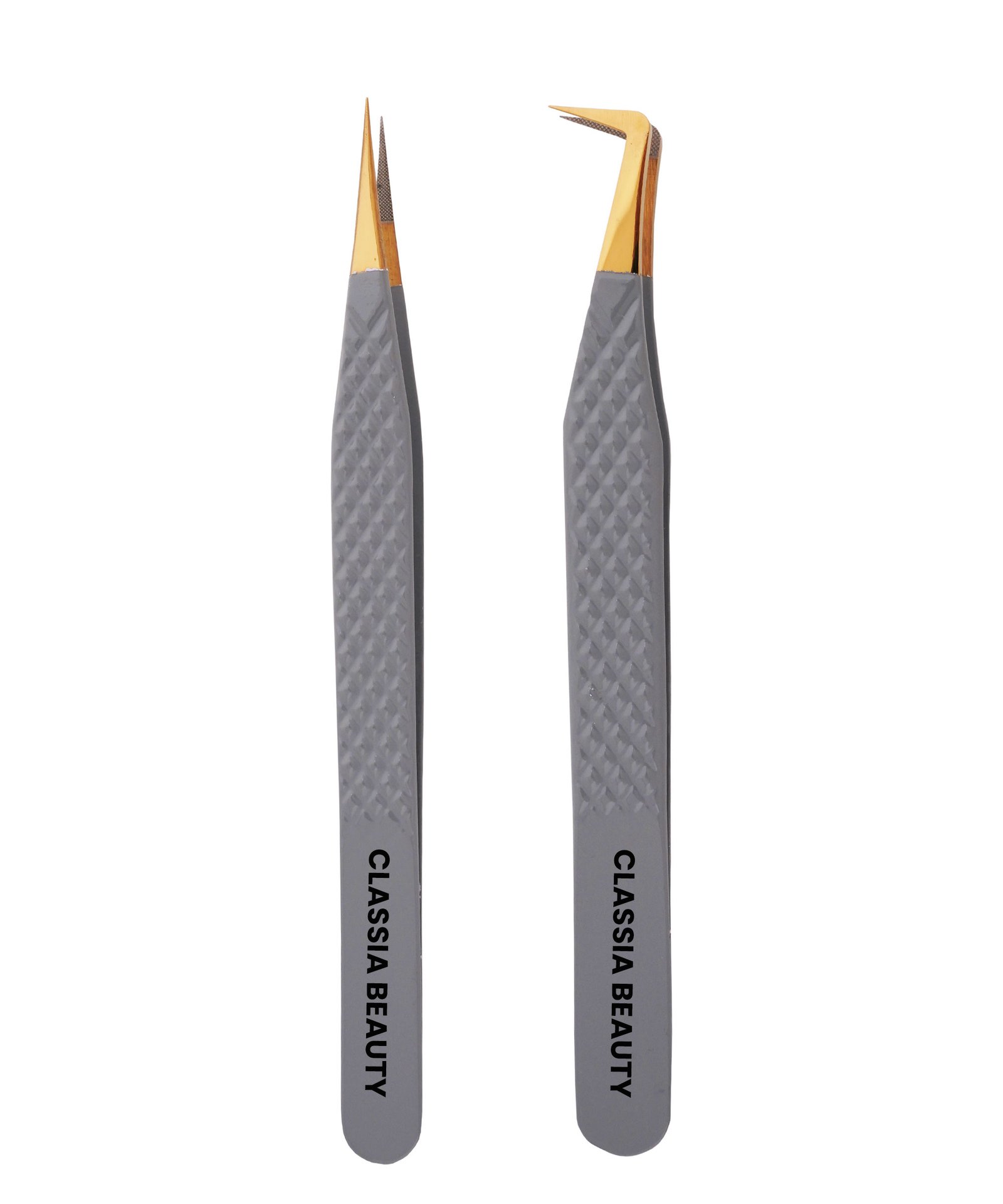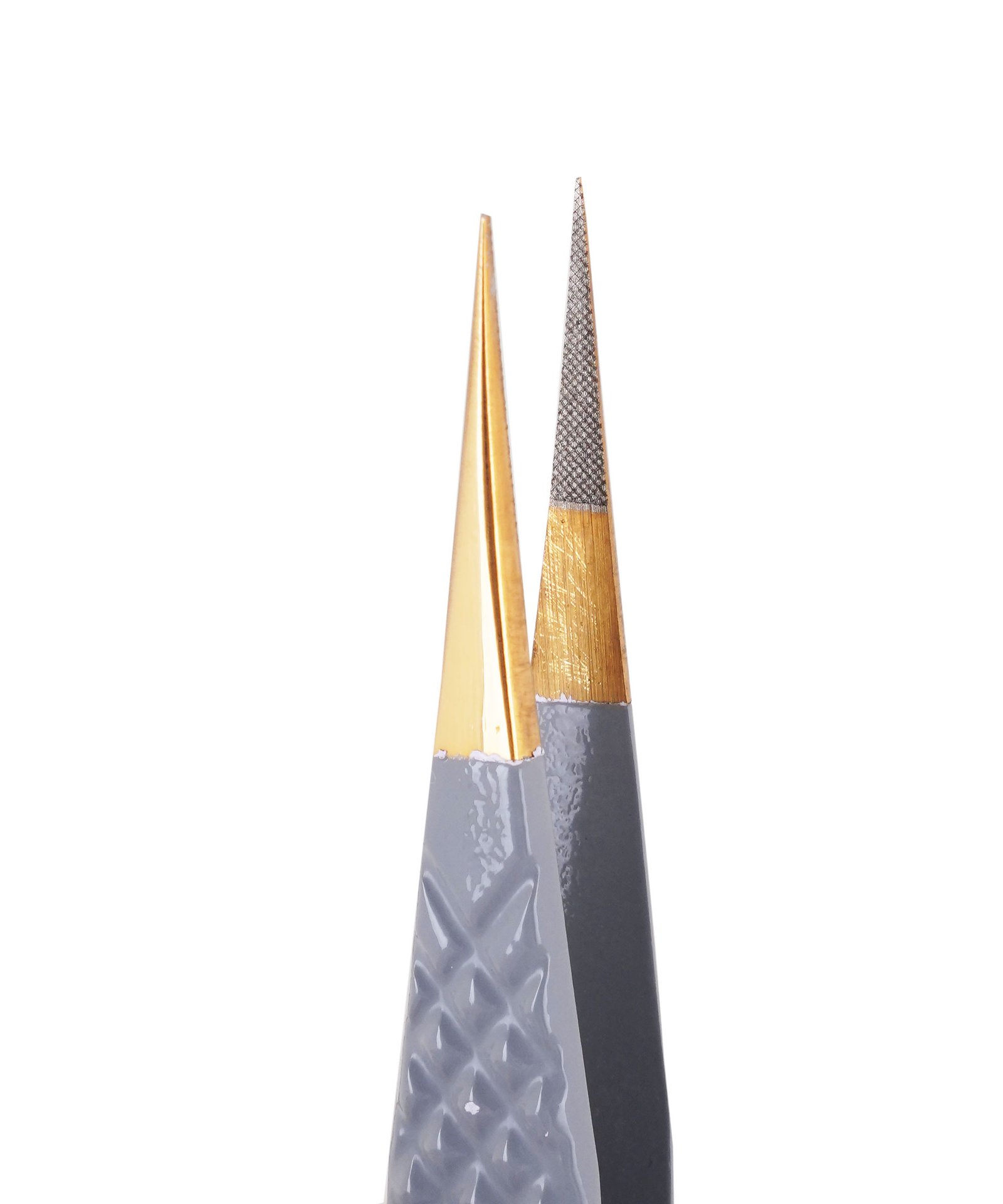 Grey 90-degree boot & Straight eyelash extension tweezer with gold Tip Fiber-Tip has been crafted using 100% stainless steel for precision and, consequently, convenience. Moreover, this lightweight, durable set is perfect for lash artists who are working on their own projects as well as professional lash artists.