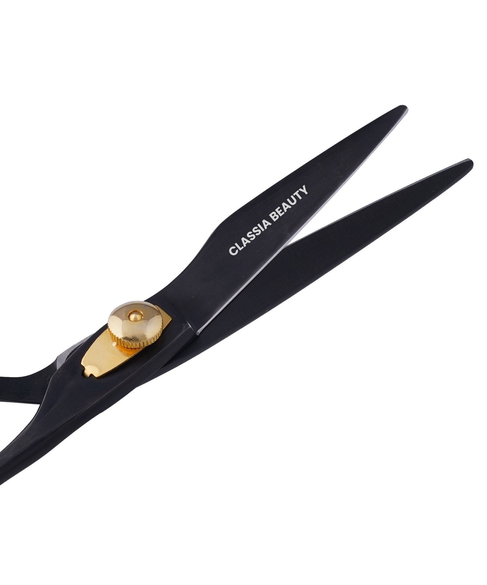 Professional Fancy Black and Gold Barber Shears made from 100% premium stainless steel, this set includes one straight-blade cutting shear and one thinning scissor for clean, smooth, and precise cuts. The ergonomic handles reduce hand and wrist strain, making them easy for barbers, stylists, and home users alike. With ultra-sharp blades, a lightweight feel, and an adjustable tension screw, these shears offer comfortable, effortless, and long-lasting performance.