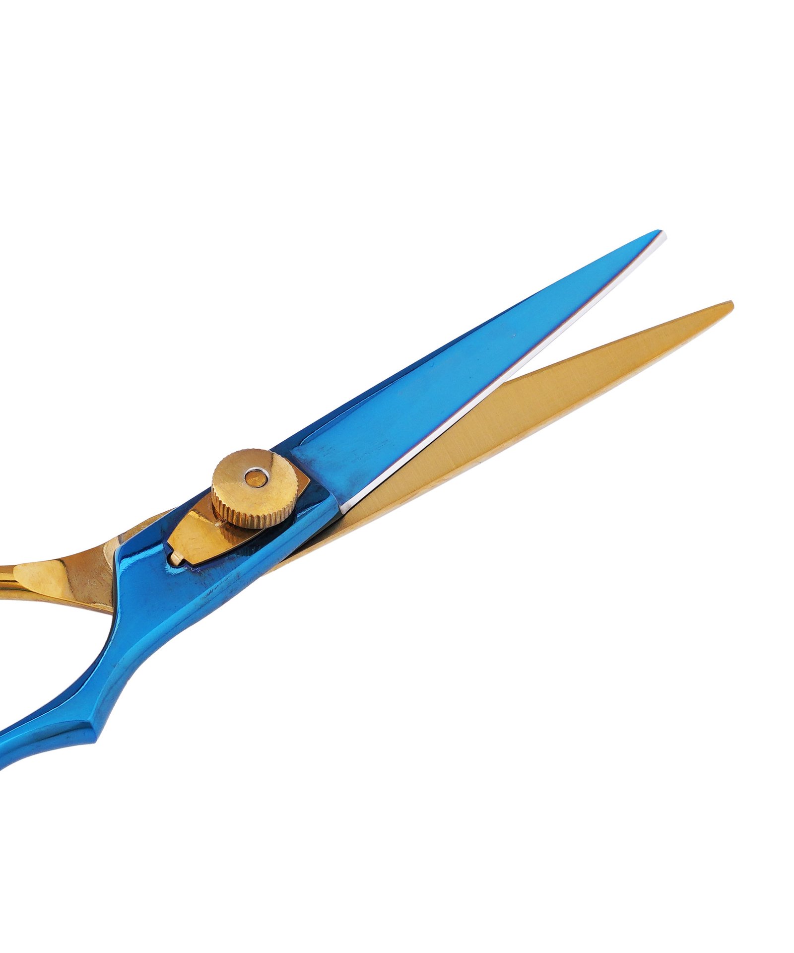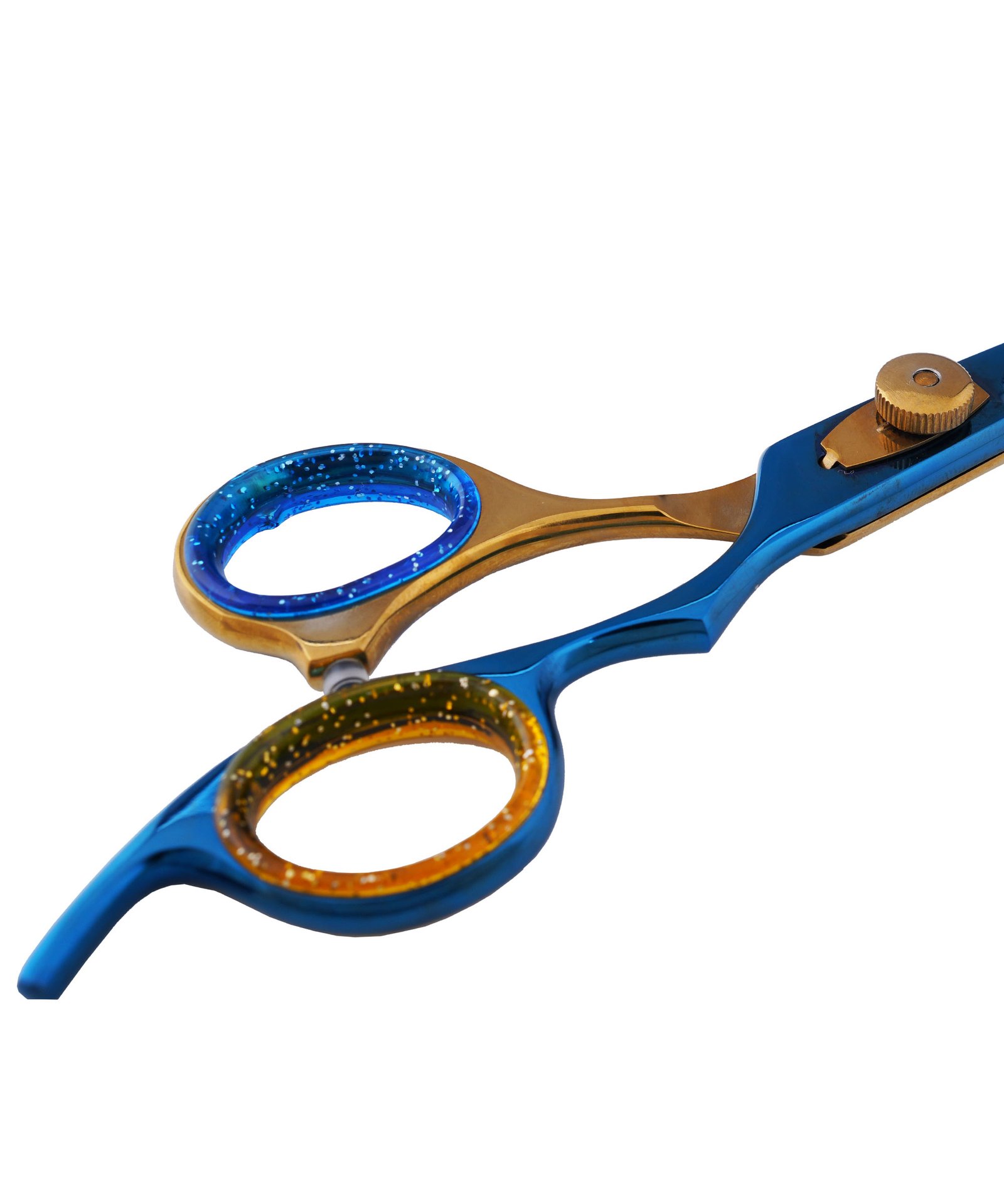 Professional Fancy Blue and Gold Barber Shears made from 100% premium stainless steel, this set includes one straight-blade cutting shear and one thinning scissor for clean, smooth, and precise cuts. The ergonomic handles reduce hand and wrist strain, making them easy for barbers, stylists, and home users alike. With ultra-sharp blades, a lightweight feel, and an adjustable tension screw, these shears offer comfortable, effortless, and long-lasting performance.