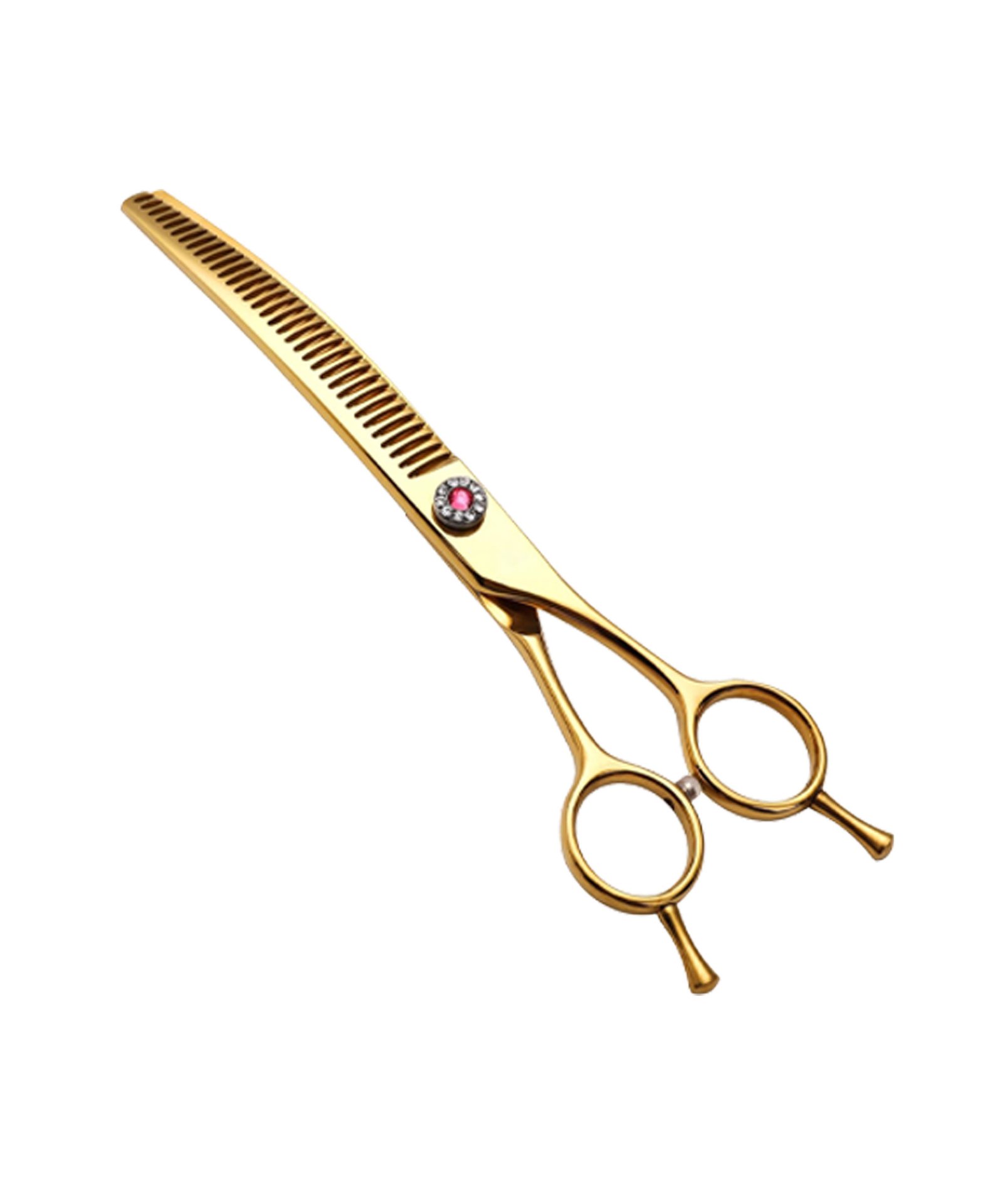 Gold Professional Fancy Dog Grooming Scissors Pet Curved Thinning Shears 7.0” made from 100% premium stainless steel, this set includes one straight-blade cutting shear and one thinning scissor for clean, smooth, and precise cuts. The ergonomic handles reduce hand and wrist strain, making them easy for barbers, stylists, and home users alike. With ultra-sharp blades, a lightweight feel, and an adjustable tension screw, these shears offer comfortable, effortless, and long-lasting performance.