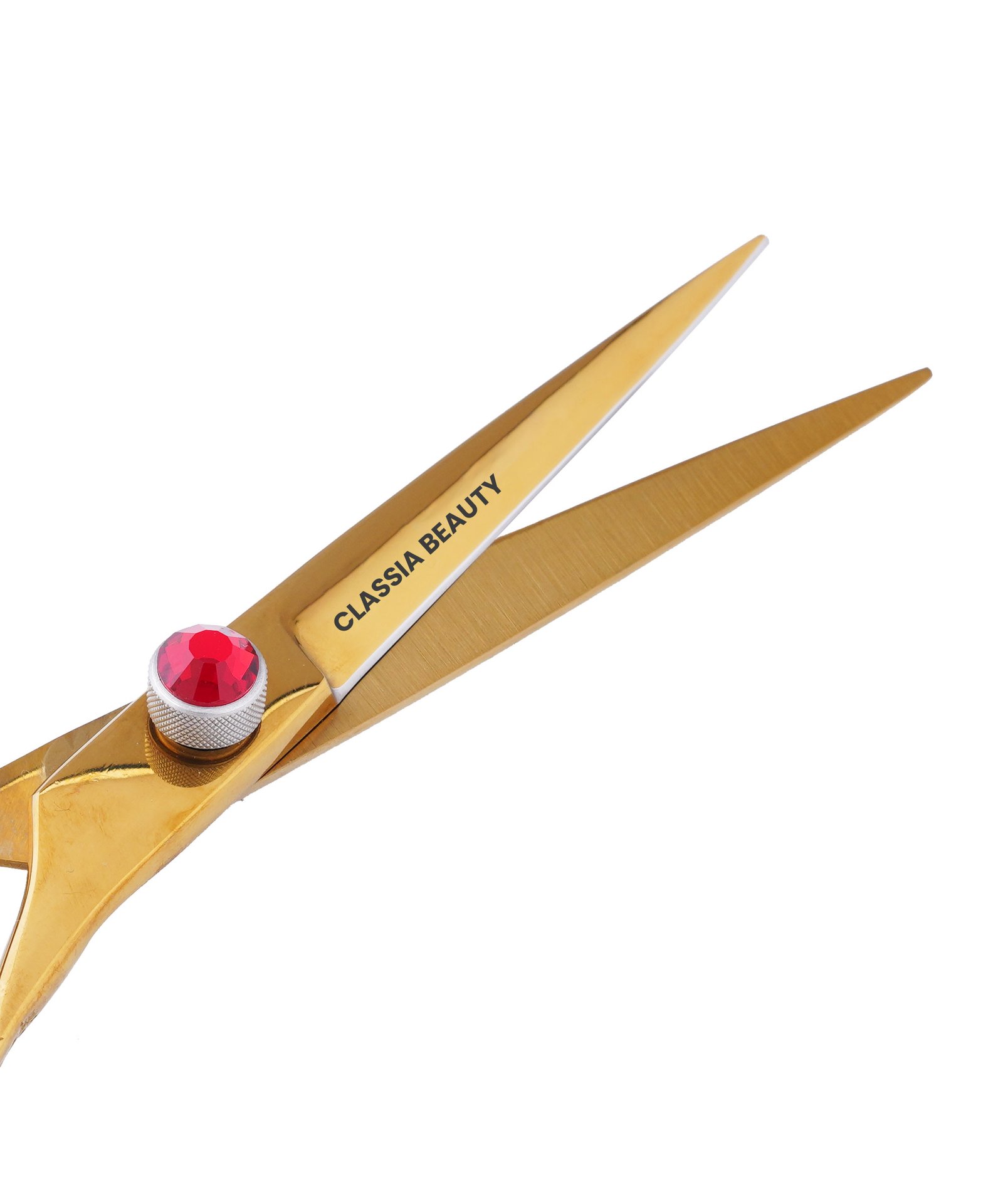 Professional Fancy Gold Barber Shears made from 100% premium stainless steel, this set includes one straight-blade cutting shear and one thinning scissor for clean, smooth, and precise cuts. The ergonomic handles reduce hand and wrist strain, making them easy for barbers, stylists, and home users alike. With ultra-sharp blades, a lightweight feel, and an adjustable tension screw, these shears offer comfortable, effortless, and long-lasting performance.